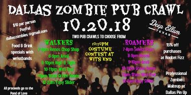 Join us in Deep Ellum starting at 7:00pm on Saturday, October 19th for the 5th Annual Dallas Zombie Pub Crawl. Proceeds to benefit Pond of Love.
